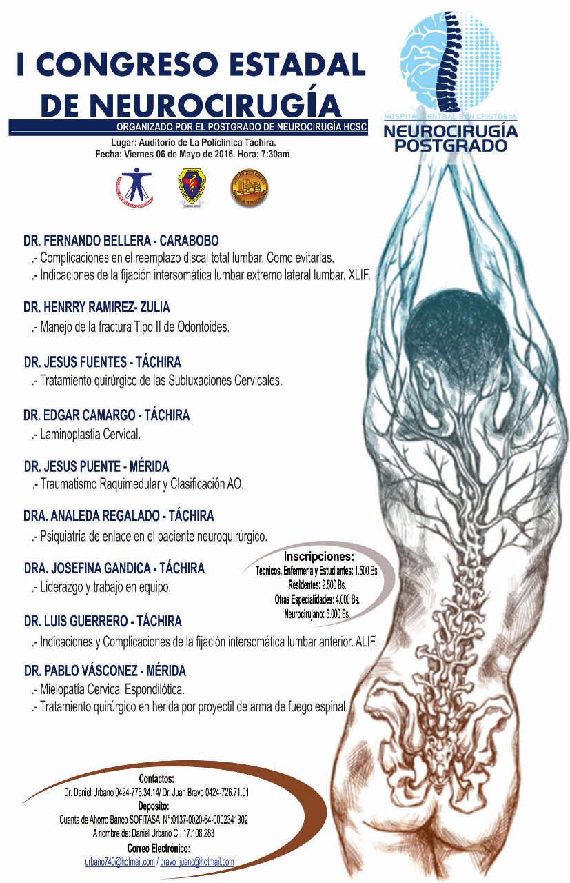 En su primer aniversario el postgrado de Neurocirugía del Hospital Central de San Cristóbal, coordinó para este próximo 06 de mayo el Primer Congreso Estadal de Neurocirugía, en el auditorio de la Policlínica Táchira de ocho de la mañana a seis de la tarde.