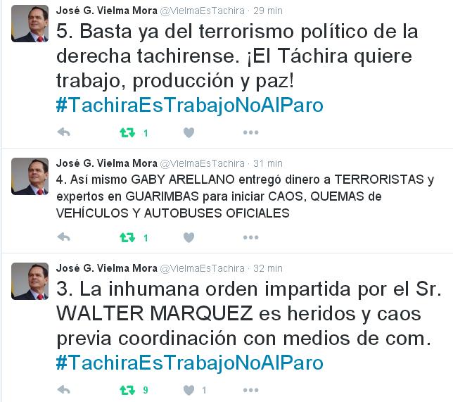 El Gobernador del estado Táchira, José Gregorio Vielma Mora, denunció a través de su cuenta twitter, @vielmaestachira, que dirigentes Walter Márquez y la diputada Gaby Arellano están preparando acciones violentas en el estado en horas de la tarde de hoy lunes 13 de junio
