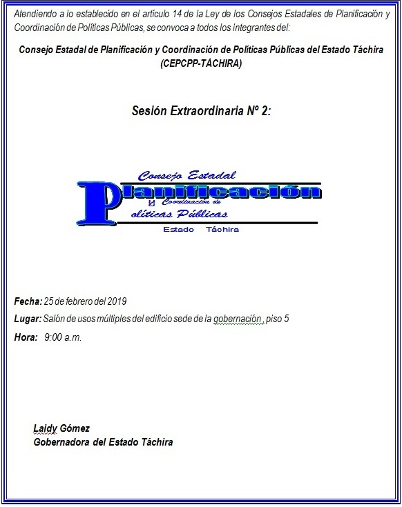INVITACIÓN: Consejo Estadal de Planificación y Coordinación de Políticas Públicas del Estado Táchira Posted on 21 de febrero de 201914 de febrero de 2022 by Automatizacion_2021