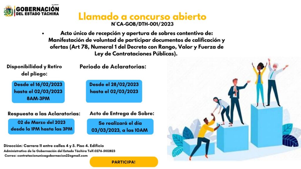 Llamado a Concurso Abierto para contratación del Servicio de Atencion Primaria de Salud Básica Posted on 16 de febrero de 202314 de marzo de 2023 by LARISSA CHACON Llamado a Concurso Abierto para la Contratación del Servicio de Salud Básica para los empleados de la Gobernación del estado Táchira.