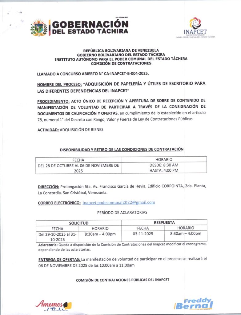 ADQUISICION DE PAPELERIA Y ÚTILES DE ESCRITORIO PARA LAS DIFERENTES DEPENDENCIAS DEL INAPCET Posted on 27 de octubre de 202523 de enero de 2026 by LARISSA CHACON CA-INAPCET-B-004-2025