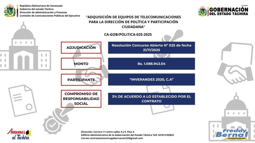 “ADQUISICIÓN DE EQUIPOS DE TELECOMUNICACIONES PARA LA DIRECCIÓN DE POLÍTICA Y PARTICIPACIÓN CIUDADANA” Posted on 5 de noviembre de 20254 de diciembre de 2025 by LARISSA CHACON CA-GOB/POLITICA-025-2025
