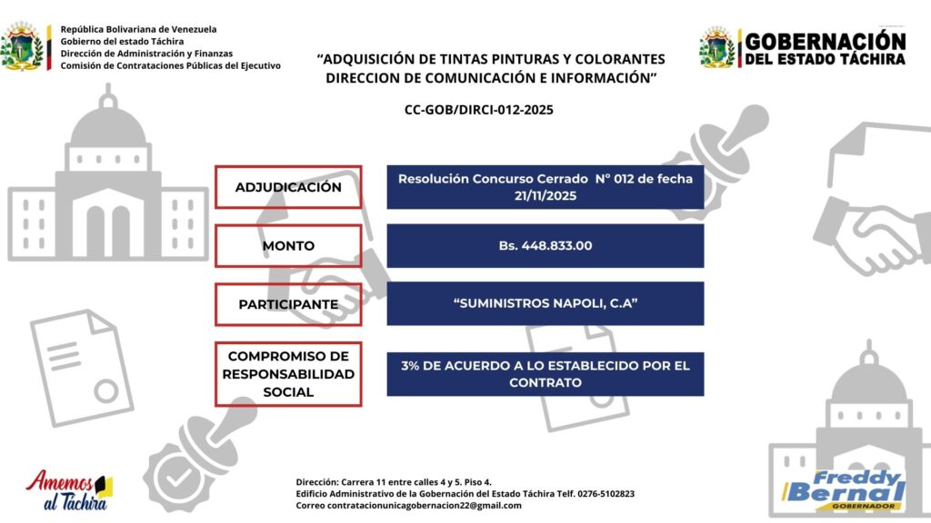 ADQUISICIÓN DE TINTAS PINTURAS Y COLORANTES DIRECCION DE COMUNICACIÓN E INFORMACIÓN Posted on 25 de noviembre de 202523 de enero de 2026 by LARISSA CHACON CC-GOB/DIRCI-012-2025