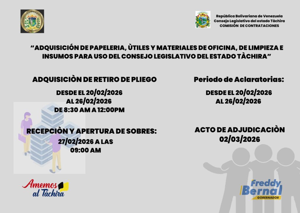 “CONTRATO MARCO PARA LA ADQUISICIÒN DE PAPELERIA, ÙTILES Y MATERIALES DE OFICINA, DE LIMPIEZA E INSUMOS PARA USO DEL CONSEJO LEGISLATIVO DEL ESTADO TÀCHIRA” Posted on 19 de febrero de 2026 by LARISSA CHACON