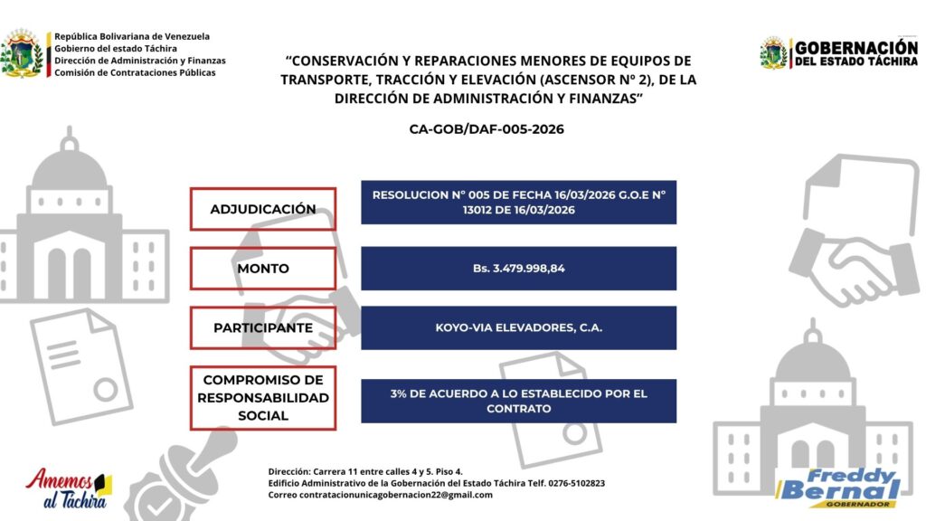 “CONSERVACIÓN Y REPARACIONES MENORES DE EQUIPOS DE TRANSPORTE, TRACCIÓN Y ELEVACIÓN (ASCENSOR Nº 2), DE LA DIRECCIÓN DE ADMINISTRACIÓN Y FINANZAS” Posted on 18 de marzo de 202623 de abril de 2026 by LARISSA CHACON CA-GOB/DAF-005-2026