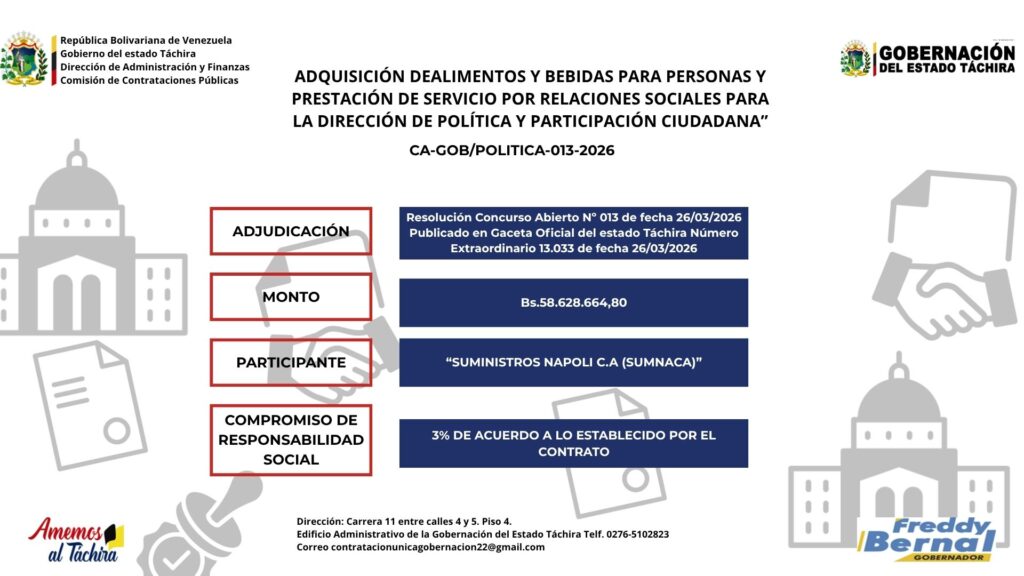“ADQUISICIÓN DE ALIMENTOS Y BEBIDAS PARA PERSONAS Y PRESTACIÓN DE SERVICIO POR RELACIONES SOCIALES PARA LA DIRECCIÓN DE POLÍTICA Y PARTICIPACIÓN CIUDADANA” Posted on 31 de marzo de 202623 de abril de 2026 by LARISSA CHACON CA-GOB/POLITICA-013-2026