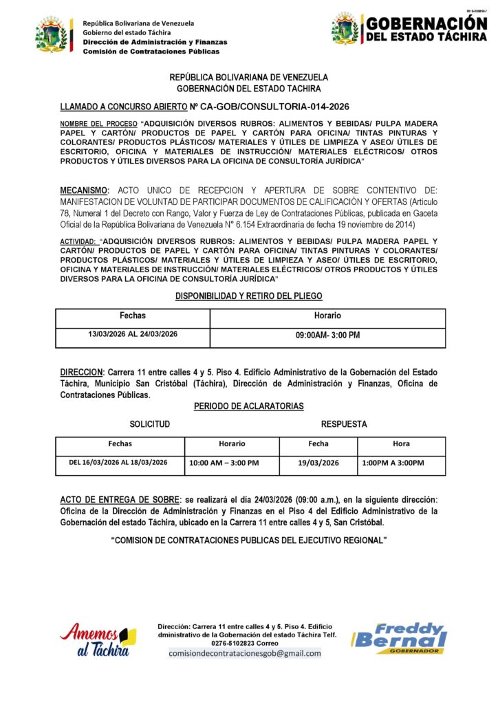 “ADQUISICIÓN DIVERSOS RUBROS: ALIMENTOS Y BEBIDAS/ PULPA MADERA PAPEL Y CARTÓN/ PRODUCTOS DE PAPEL Y CARTÓN PARA OFICINA/ TINTAS PINTURAS Y COLORANTES/ PRODUCTOS PLÁSTICOS/ MATERIALES Y ÚTILES DE LIMPIEZA Y ASEO/ ÚTILES DE ESCRITORIO, OFICINA Y MATERIALES DE INSTRUCCIÓN/ MATERIALES ELÉCTRICOS/ OTROS PRODUCTOS Y ÚTILES DIVERSOS PARA LA OFICINA DE CONSULTORÍA JURÍDICA” Posted on 12 de marzo de 202616 de abril de 2026 by LARISSA CHACON CA-GOB/CONSULTORIA-014-2026