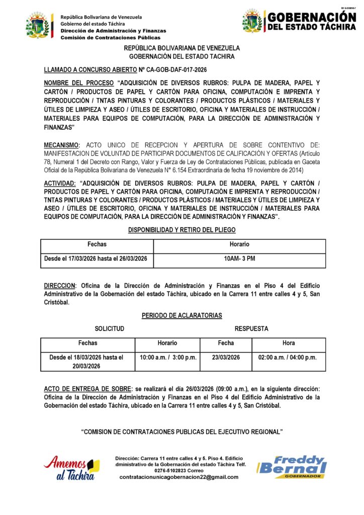 “ADQUISICIÓN DE DIVERSOS RUBROS: PULPA DE MADERA, PAPEL Y CARTÓN / PRODUCTOS DE PAPEL Y CARTÓN PARA OFICINA, COMPUTACIÓN E IMPRENTA Y REPRODUCCIÓN / TINTAS PINTURAS Y COLORANTES / PRODUCTOS PLÁSTICOS / MATERIALES Y ÚTILES DE LIMPIEZA Y ASEO / ÚTILES DE ESCRITORIO, OFICINA Y MATERIALES DE INSTRUCCIÓN / MATERIALES PARA EQUIPOS DE COMPUTACIÓN, PARA LA DIRECCIÓN DE ADMINISTRACIÓN Y FINANZAS” Posted on 16 de marzo de 202616 de abril de 2026 by LARISSA CHACON CA-GOB/DAF-017-2026