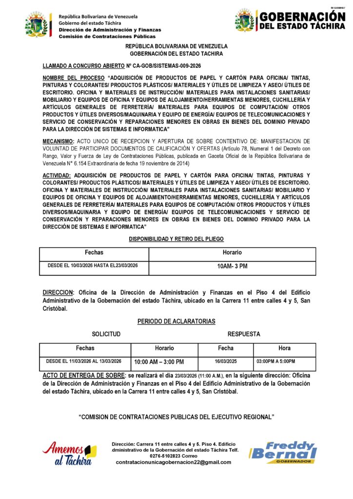 “ADQUISICIÓN DE PRODUCTOS DE PAPEL Y CARTÓN PARA OFICINA/ TINTAS, PINTURAS Y COLORANTES/ PRODUCTOS PLÁSTICOS/ MATERIALES Y ÚTILES DE LIMPIEZA Y ASEO/ ÚTILES DE ESCRITORIO. OFICINA Y MATERIALES DE INSTRUCCIÓN/ MATERIALES PARA INSTALACIONES SANITARIAS/ MOBILIARIO Y EQUIPOS DE OFICINA Y EQUIPOS DE ALOJAMIENTO/HERRAMIENTAS MENORES, CUCHILLERÍA Y ARTÍCULOS GENERALES DE FERRETERÍA/ MATERIALES PARA EQUIPOS DE COMPUTACIÓN/ OTROS PRODUCTOS Y ÚTILES DIVERSOS/MAQUINARIA Y EQUIPO DE ENERGÍA/ EQUIPOS DE TELECOMUNICACIONES Y SERVICIO DE CONSERVACIÓN Y REPARACIONES MENORES EN OBRAS EN BIENES DEL DOMINIO PRIVADO PARA LA DIRECCIÓN DE SISTEMAS E INFORMATICA” Posted on 9 de marzo de 202616 de abril de 2026 by LARISSA CHACON CA-GOB/SISTEMAS-009-2026