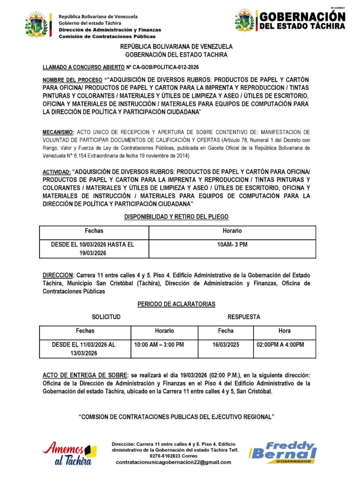“ADQUISICIÓN DE DIVERSOS RUBROS: PRODUCTOS DE PAPEL Y CARTÓN PARA OFICINA/ PRODUCTOS DE PAPEL Y CARTON PARA LA IMPRENTA Y REPRODUCCION / TINTAS PINTURAS Y COLORANTES / MATERIALES Y ÚTILES DE LIMPIEZA Y ASEO / ÚTILES DE ESCRITORIO, OFICINA Y MATERIALES DE INSTRUCCIÓN / MATERIALES PARA EQUIPOS DE COMPUTACIÓN PARA LA DIRECCIÓN DE POLÍTICA Y PARTICIPACIÓN CIUDADANA” Posted on 9 de marzo de 202616 de abril de 2026 by LARISSA CHACON CA-GOB/POLITICA-012-2026