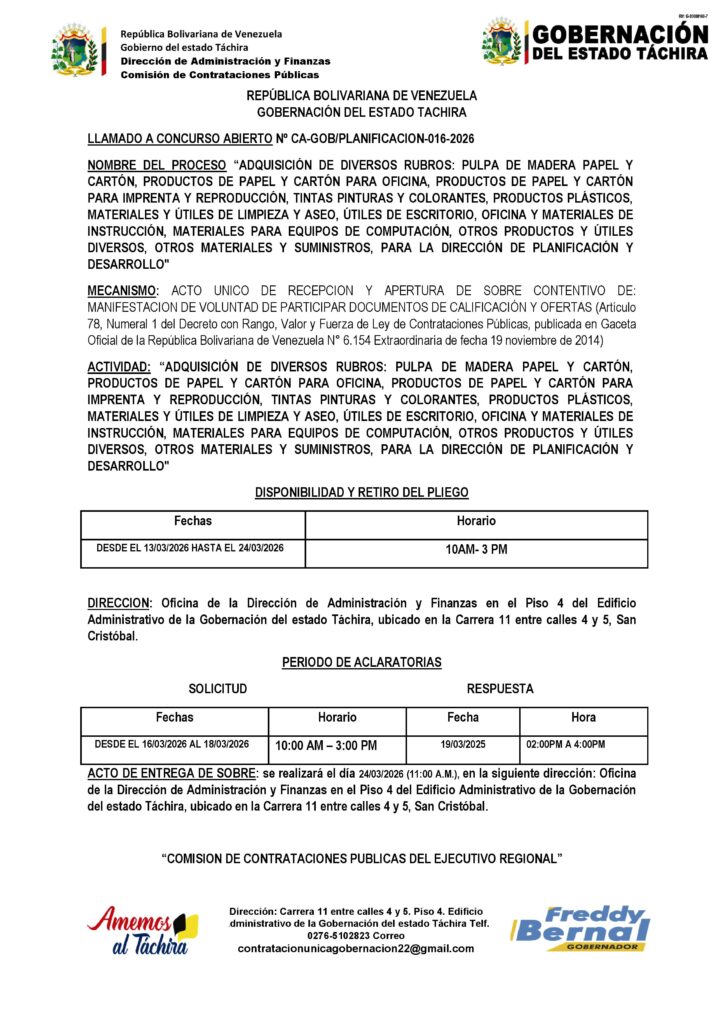 “ADQUISICIÓN DE DIVERSOS RUBROS: PULPA DE MADERA PAPEL Y CARTÓN, PRODUCTOS DE PAPEL Y CARTÓN PARA OFICINA, PRODUCTOS DE PAPEL Y CARTÓN PARA IMPRENTA Y REPRODUCCIÓN, TINTAS PINTURAS Y COLORANTES, PRODUCTOS PLÁSTICOS, MATERIALES Y ÚTILES DE LIMPIEZA Y ASEO, ÚTILES DE ESCRITORIO, OFICINA Y MATERIALES DE INSTRUCCIÓN, MATERIALES PARA EQUIPOS DE COMPUTACIÓN, OTROS PRODUCTOS Y ÚTILES DIVERSOS, OTROS MATERIALES Y SUMINISTROS, PARA LA DIRECCIÓN DE PLANIFICACIÓN Y DESARROLLO” Posted on 12 de marzo de 202616 de abril de 2026 by LARISSA CHACON CA-GOB/PLANIFICACION-016-2026