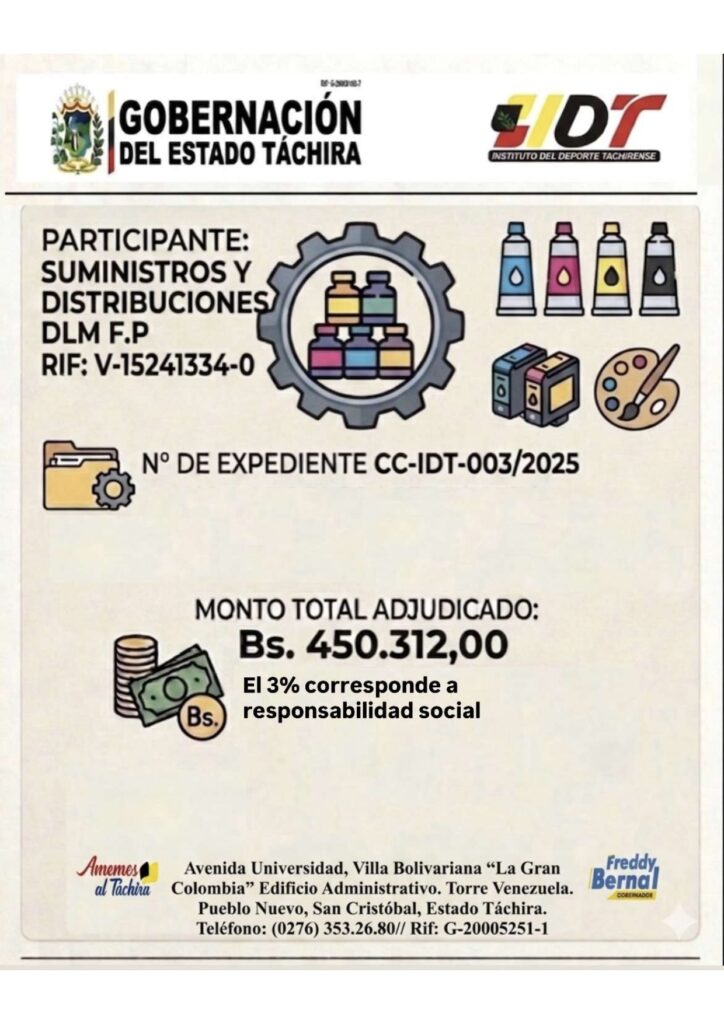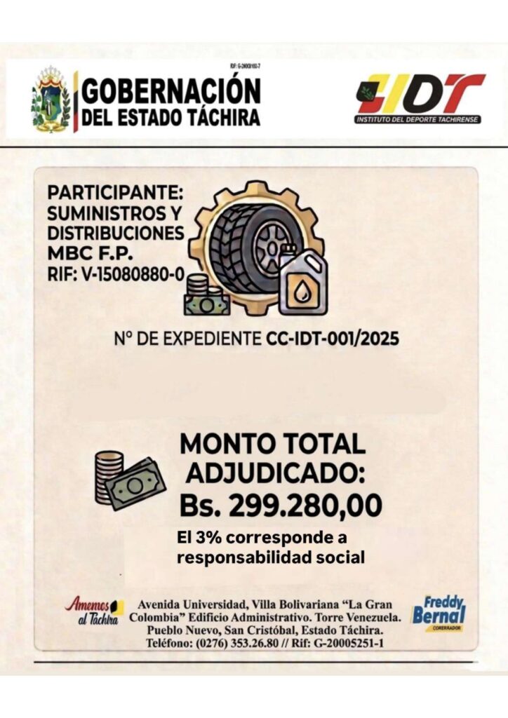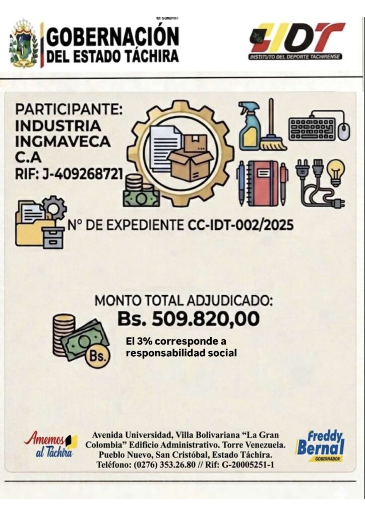 CONTRATACIÓN PARA ADQUISICIÓN DE BIENES Y PRESTACIÓN DE SERVICIOS PARA LA ORGANIZACIÓN DE LAS ACTIVIDADES DEPORTIVAS DE ALTO RENDIMIENTO Y RECREATIVAS ORGANIZADAS POR EL INSTITUTO DEL DEPORTE TACHIRENSE -IDT Posted on 14 de febrero de 202519 de febrero de 2026 by LARISSA CHACON