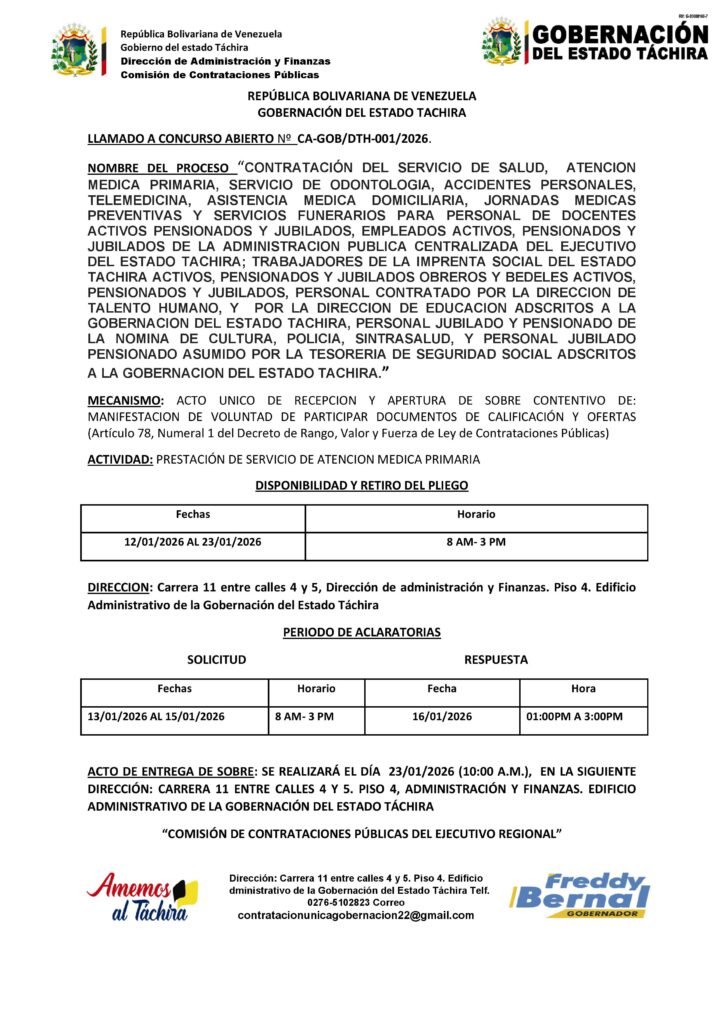 “CONTRATACIÓN DEL SERVICIO DE SALUD, ATENCIÓN PRIMARIA DE SALUD, ATENCIÓN MEDICA PRIMARIA, SERVICIO DE ODONTOLOGÍA, ACCIDENTES PERSONALES, TELEMEDICINA, ASISTENCIA MEDICA DOMICILIARIA, JORNADAS MEDICAS PREVENTIVAS Y SERVICIOS FUNERARIOS PARA PERSONAL DE DOCENTES ACTIVOS PENSIONADOS Y JUBILADOS, EMPLEADOS ACTIVOS, PENSIONADOS Y JUBILADOS DE LA ADMINISTRACIÓN PÚBLICA CENTRALIZADA DEL EJECUTIVO DEL ESTADO TÁCHIRA; TRABAJADORES DE LA IMPRENTA SOCIAL DEL ESTADO TÁCHIRA ACTIVOS, PENSIONADOS Y JUBILADOS OBREROS Y BEDELES ACTIVOS, PENSIONADOS Y JUBILADOS, PERSONAL CONTRATADO POR LA DIRECCIÓN DE TALENTO HUMANO, Y POR LA DIRECCIÓN DE EDUCACIÓN ADSCRITOS A LA GOBERNACIÓN DEL ESTADO TÁCHIRA, PERSONAL JUBILADO Y PENSIONADO DE LA NÓMINA DE CULTURA, POLICÍA, SINTRASALUD, Y PERSONAL JUBILADO PENSIONADO ASUMIDO POR LA TESORERÍA DE SEGURIDAD SOCIAL ADSCRITOS A LA GOBERNACIÓN DEL ESTADO TÁCHIRA” Posted on 9 de enero de 202619 de febrero de 2026 by LARISSA CHACON CA-GOB/DTH-001/2026