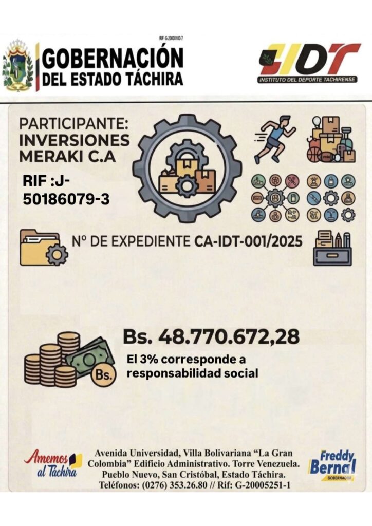CONTRATACION PARA ADQUISICIÒN DE BIENES Y PRESTACIÒN DE SERVICIOS PARA LA ORGANIZACION DE LAS ACTIVIDADES DEPORTIVAS DE ALTO RENDIMIENTO Y RECRETAIVAS ORGANIZADAS POR EL INSTITUTO DEL DEPORTE TACHIRENSE (IDT) Posted on 6 de marzo de 20256 de abril de 2026 by LARISSA CHACON CA-IDT-001/2025