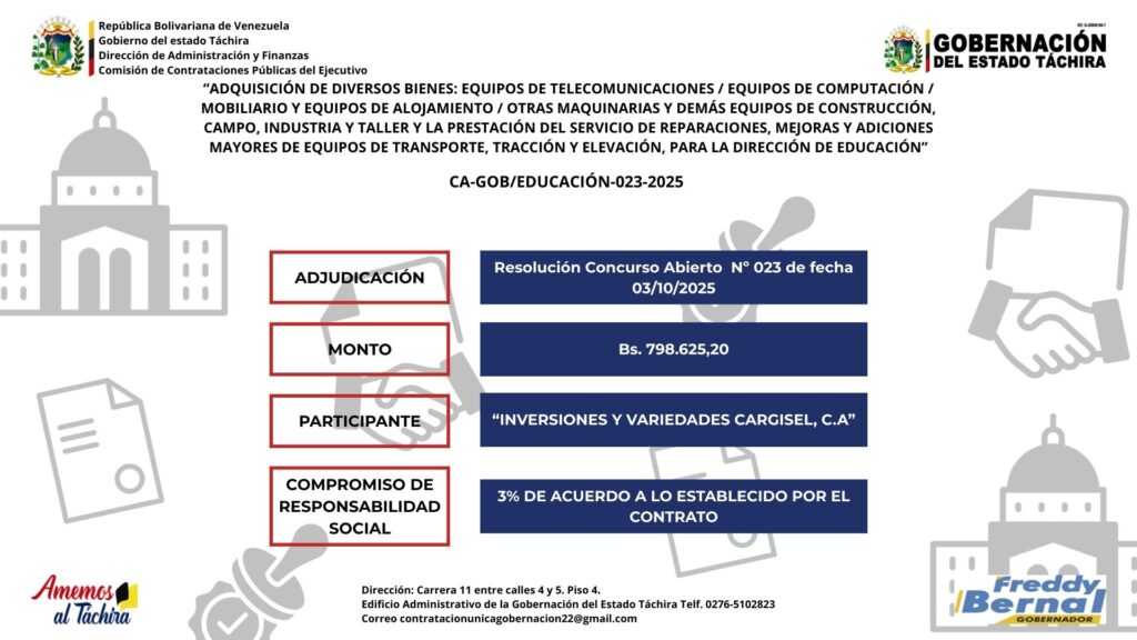 “ADQUISICIÓN DE DIVERSOS BIENES: EQUIPOS DE TELECOMUNICACIONES / EQUIPOS DE COMPUTACIÓN / MOBILIARIO Y EQUIPOS DE ALOJAMIENTO / OTRAS MAQUINARIAS Y DEMÁS EQUIPOS DE CONSTRUCCIÓN, CAMPO, INDUSTRIA Y TALLER Y LA PRESTACIÓN DEL SERVICIO DE REPARACIONES, MEJORAS Y ADICIONES MAYORES DE EQUIPOS DE TRANSPORTE, TRACCIÓN Y ELEVACIÓN, PARA LA DIRECCIÓN DE EDUCACIÓN” Posted on 7 de octubre de 202512 de enero de 2026 by LARISSA CHACON CA-GOB/EDUCACION-023-2025 CA-GOB/EDUCACIÓN-023-2025