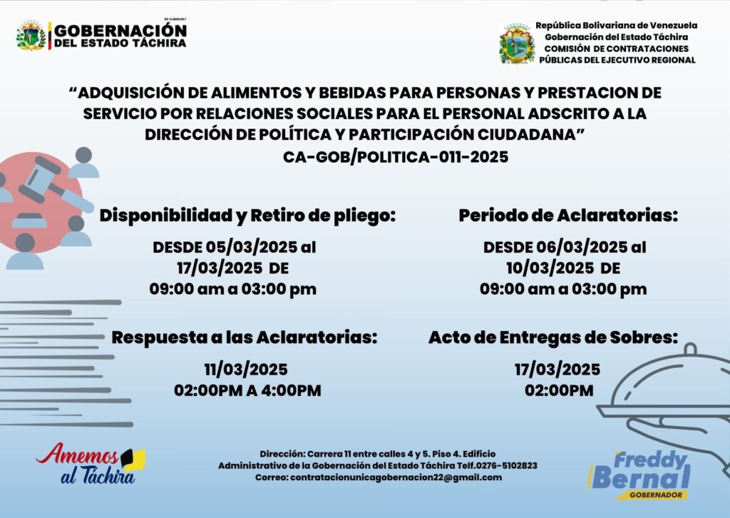 “ADQUISICIÓN DE ALIMENTOS Y BEBIDAS PARA PERSONAS Y PRESTACION DE SERVICIO POR RELACIONES SOCIALES PARA EL PERSONAL ADSCRITO A LA DIRECCIÓN DE POLÍTICA Y PARTICIPACIÓN CIUDADANA” Posted on 28 de febrero de 202521 de enero de 2026 by LARISSA CHACON CA-GOB/POLITICA-011-2025