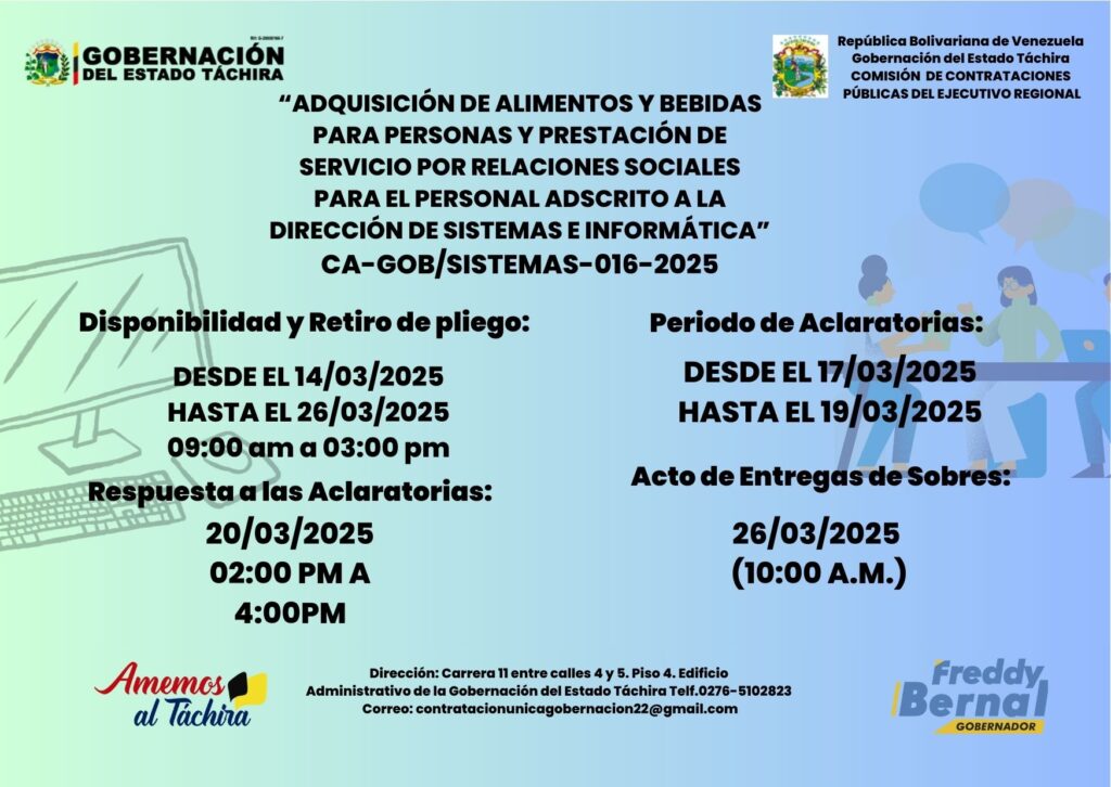 ADQUISICIÓN DE ALIMENTOS Y BEBIDAS PARA PERSONAS Y PRESTACIÓN DE SERVICIO POR RELACIONES SOCIALES PARA EL PERSONAL ADSCRITO A LA DIRECCIÓN DE SISTEMAS E INFORMÁTICA Posted on 13 de marzo de 202521 de enero de 2026 by LARISSA CHACON CA-GOB/SISTEMAS-016-2025