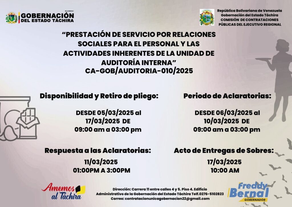 “PRESTACIÓN DE SERVICIO POR RELACIONES SOCIALES PARA EL PERSONAL Y LAS ACTIVIDADES INHERENTES DE LA UNIDAD DE AUDITORÍA INTERNA” Posted on 28 de febrero de 20256 de febrero de 2026 by LARISSA CHACON CA-GOB/AUDITORIA-010/2025