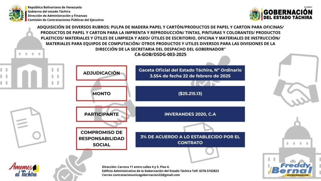 ADQUISICION DE DIVERSOS RUBROS: ALIMENTOS Y BEBIDAS PARA PERSONAS / PULPA DE MADERA, PAPEL Y CARTÓN / PRODUCTOS DE PAPEL Y CARTÓN PARA OFICINA E IMPRENTA Y REPRODUCCION / TINTAS PINTURAS Y COLORANTES / ÚTILES DE ESCRITORIO, OFICINA Y MATERIALES DE INSTRUCCION / PRODUCTOS PLASTICOS / MATERIALES Y UTILES DE LIMPIEZA Y ASEO / MATERIALES PARA EQUIPOS DE COMPUTACION / MATERIALES ELECTRICOS / HERRAMIENTAS MENORES, CUCHILLERIA Y ARTICULOS GENERALES DE FERRETERIA Y OTROS MATERIALES Y SUMINISTROS, PARA LA DIRECCION DE TALENTO HUMANO” Posted on 28 de febrero de 202521 de enero de 2026 by LARISSA CHACON CA-GOB/DTH-007-2025