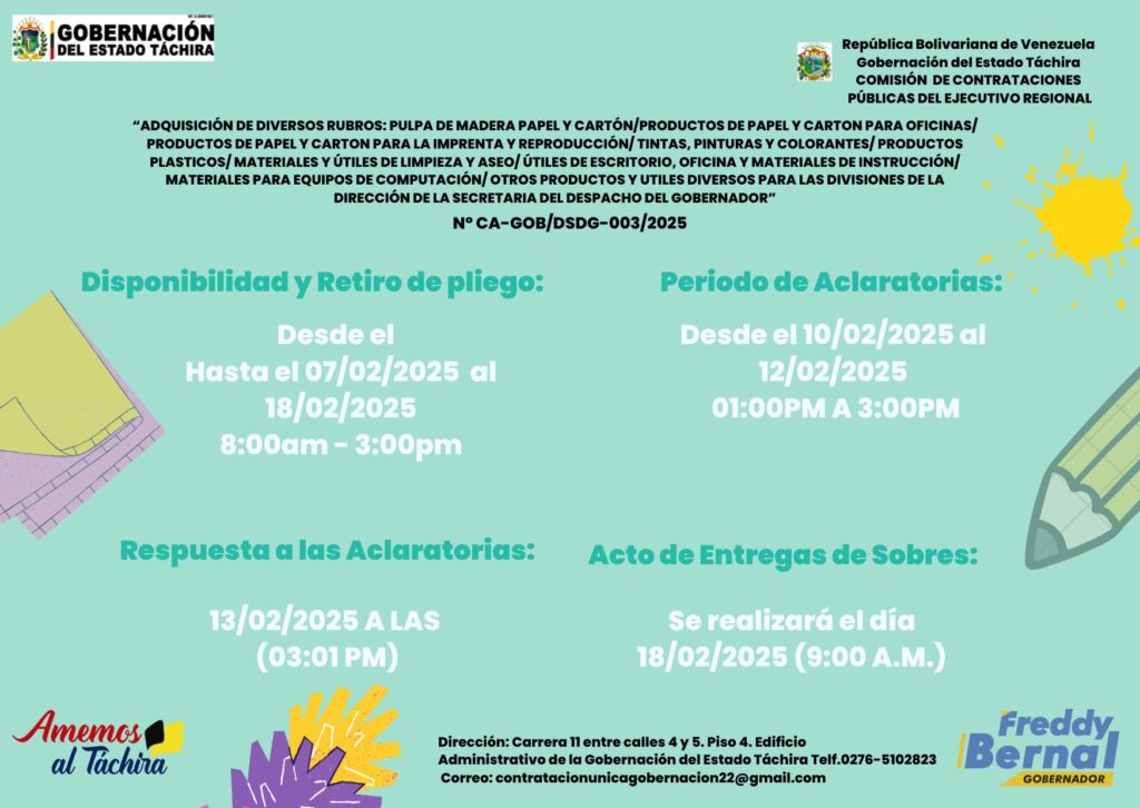Corpointa convoca a concurso abierto para la “Adquisición de material de oficina, útiles de escritorio, productos de papelería, tintas y pinturas para ser utilizados en cada una de las gerencias y departamentos pertenecientes a la Corporación de Infraestructura, Mantenimiento de Obras y Servicios del Estado Táchira”.
